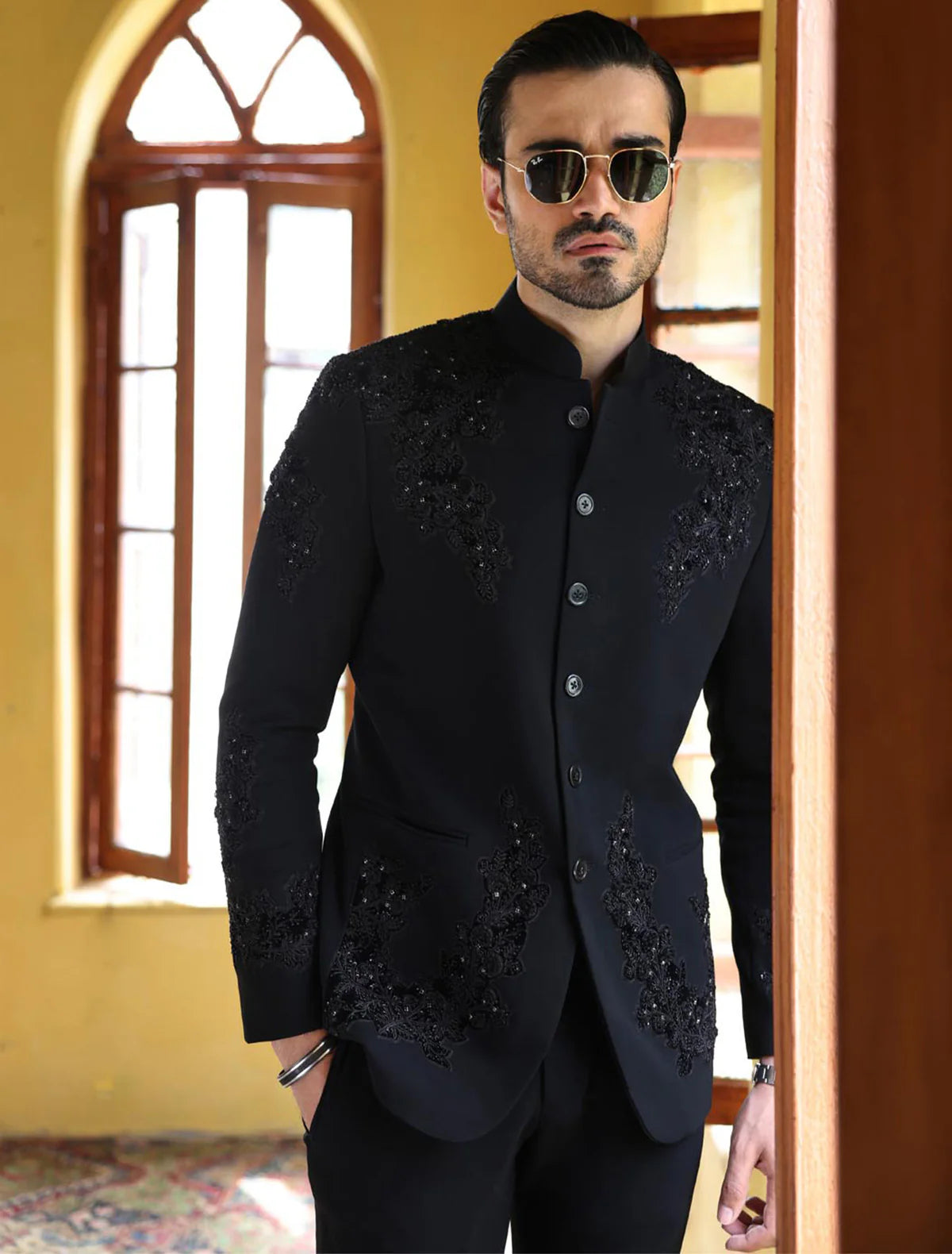 Black Bandhgala with intricate all-over embroidery, exuding elegance and grandeur. Tailored for a sharp fit, it's the perfect choice for receptions, sangeets, and evening celebrations — where tradition meets statement style