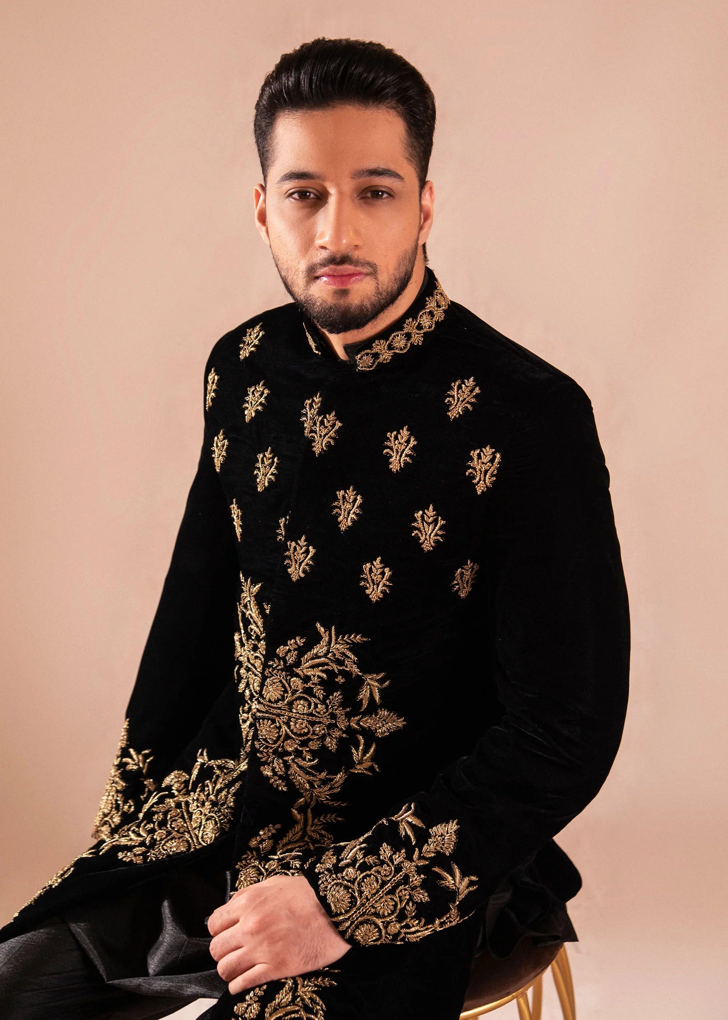 Black Velvet Sherwani with All Over Gold Embroidery | Luxurious Wedding Sherwani for Men
