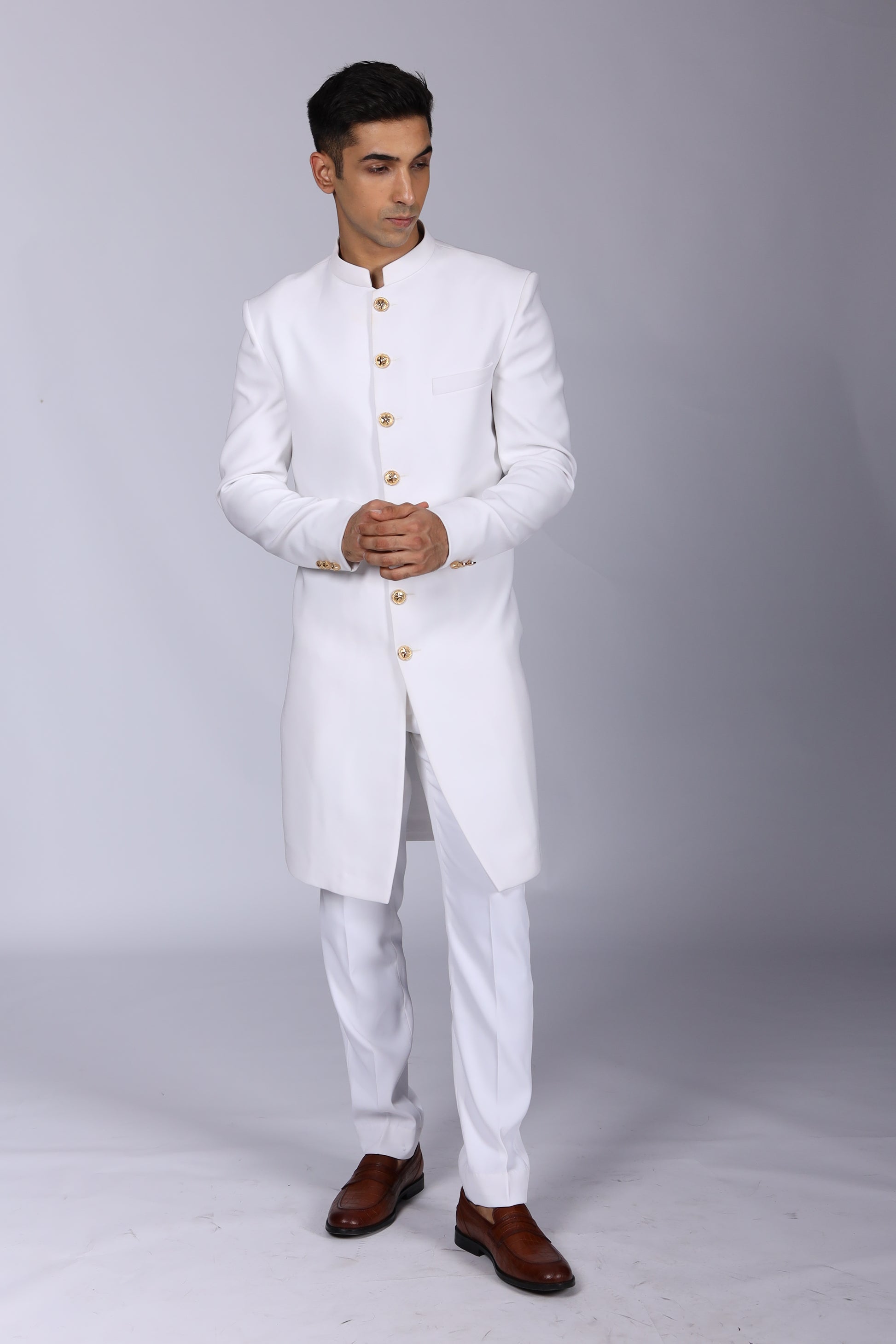 Understated and timeless, our Classic White Sherwani is a symbol of pure elegance and refined tradition. Designed with a clean silhouette and crisp finish, this piece is perfect for weddings, engagements, or any ceremonial event where sophistication is key.