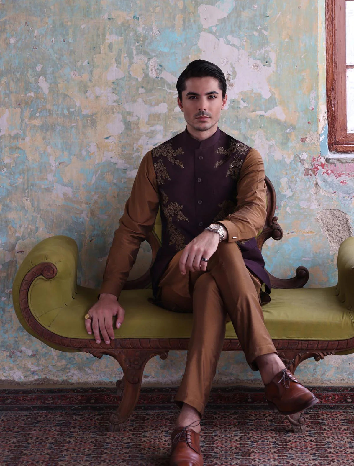 Rich maroon Bundi adorned with fine embroidery, tailored for a refined fit. Ideal for weddings, festive celebrations, and traditional gatherings — a bold and timeless choice for the modern gentleman.