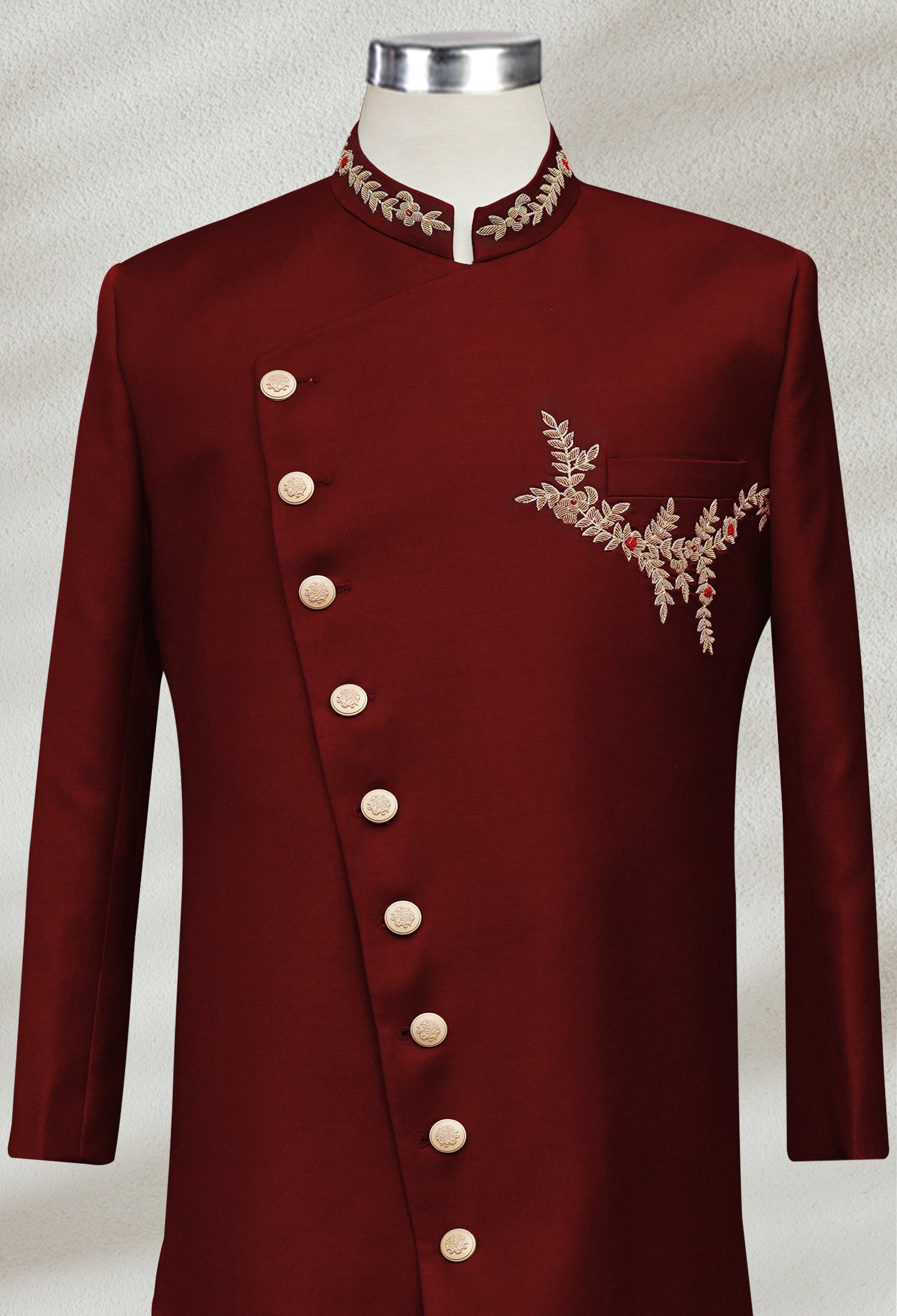 Step into elegance with this maroon sherwani, designed to make a lasting impression. Crafted from premium fabric, this sherwani features intricate hand embroidery on the front and sleeves, adding a touch of traditional artistry