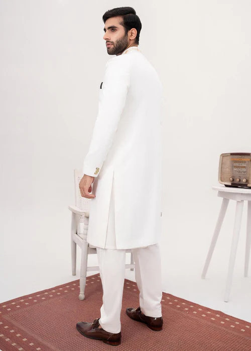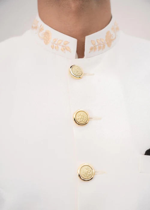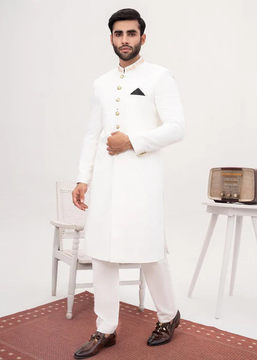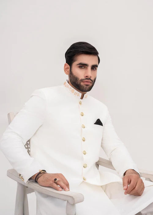 A timeless piece crafted in a soft off-white tone, this sherwani features detailed embroidery on the collar that adds a refined touch of tradition. Perfect for weddings and formal occasions, it blends simplicity with subtle grandeur.