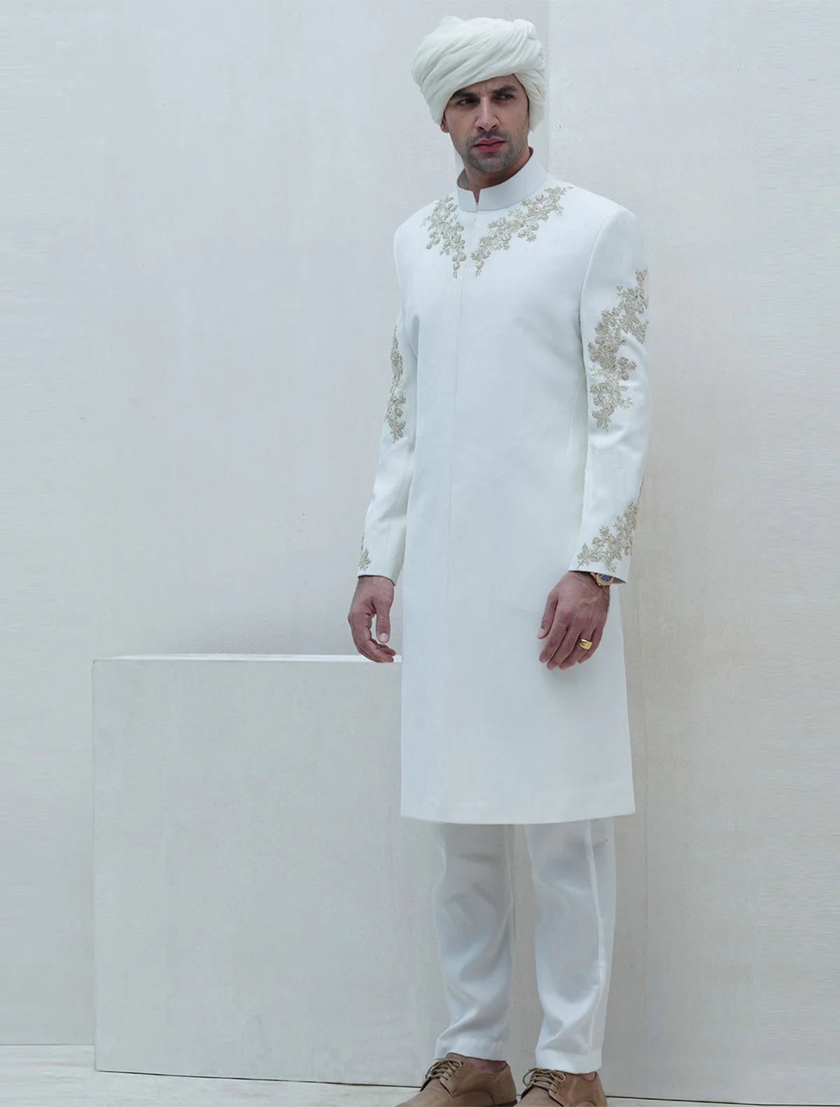 Timeless and tasteful, this Off White Sherwani features delicate embroidery on the front and sleeves—perfect for adding subtle elegance to your festive or wedding look. A refined choice for grooms and wedding guests alike.