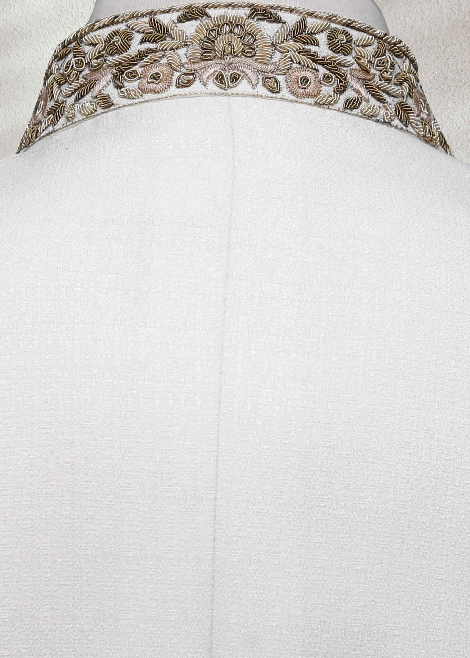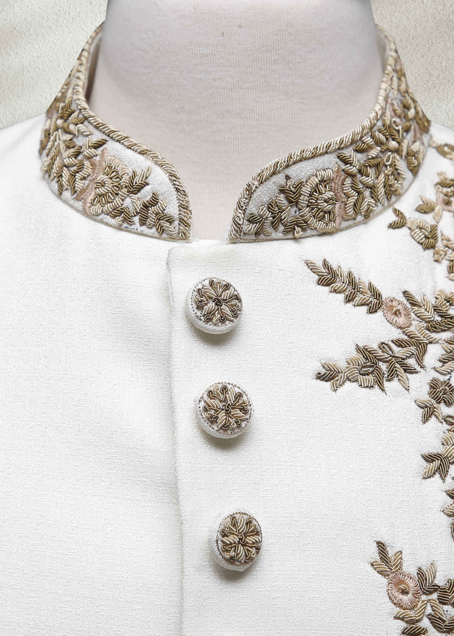 Elevate your wedding look with this White Raw Silk Sherwani, featuring delicate floral embroidery. Crafted for elegance and comfort, this sherwani is ideal for festive and special occasions.